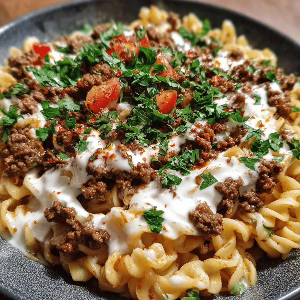 Arabic Pasta with Ground Beef & Yogurt Sauce Recipe