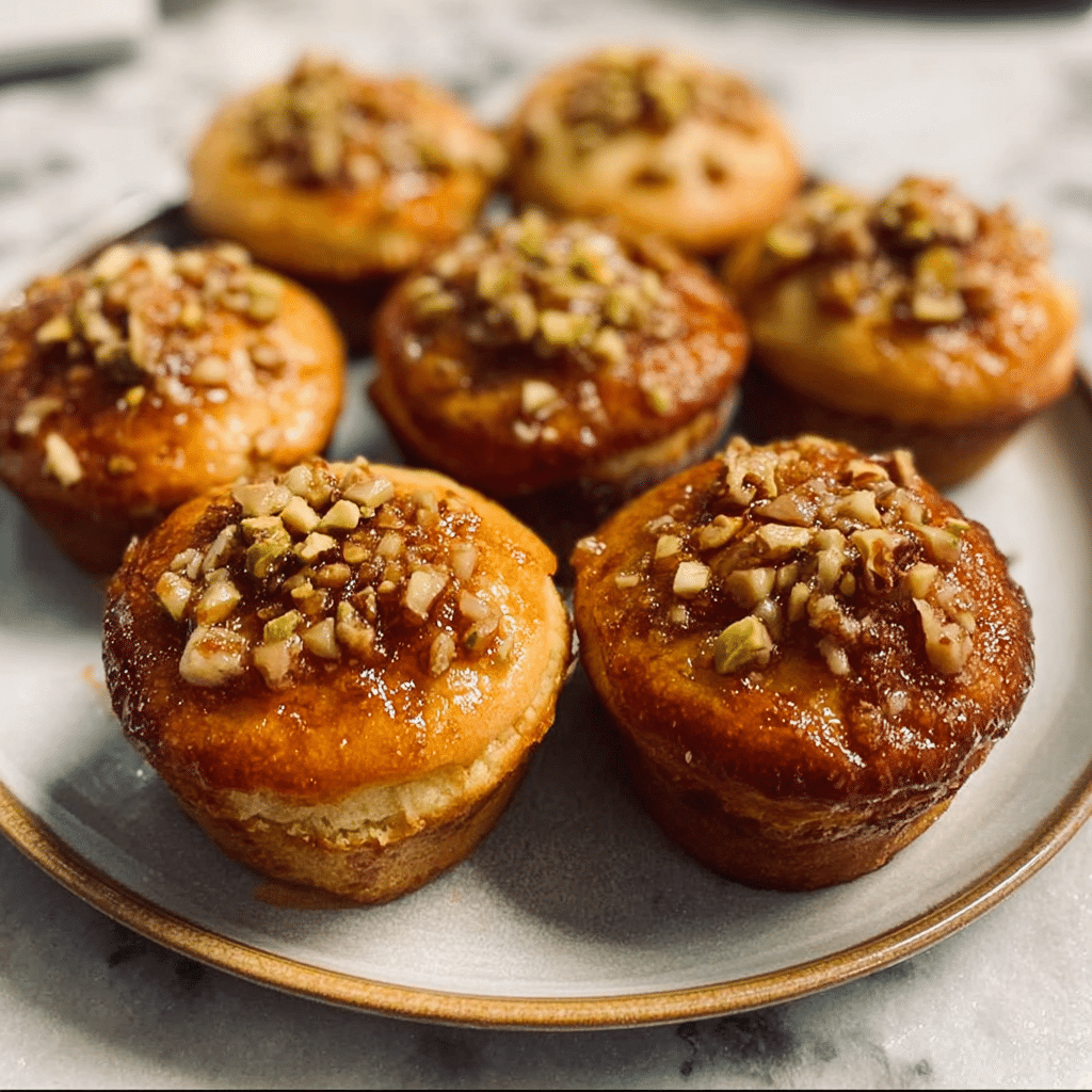 Create an elegant variation of Baklava Muffins using chopped pistachios instead of walnuts and adding 1 teaspoon rose water to the honey syrup for sophisticated floral notes.