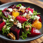 Frustrated with salads that taste bland or feel uninspired? Bloody Beet and Goat Cheese Salad is a dramatic, flavor-packed creation featuring jewel-toned roasted beets layered with creamy goat cheese, crisp greens, toasted nuts, and a sweet-tangy vinaigrette.