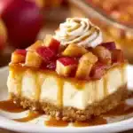 A delightful dessert that combines creamy cheesecake with sweet and tart apples, topped with rich caramel sauce.