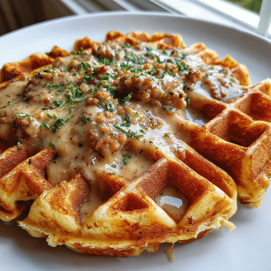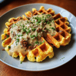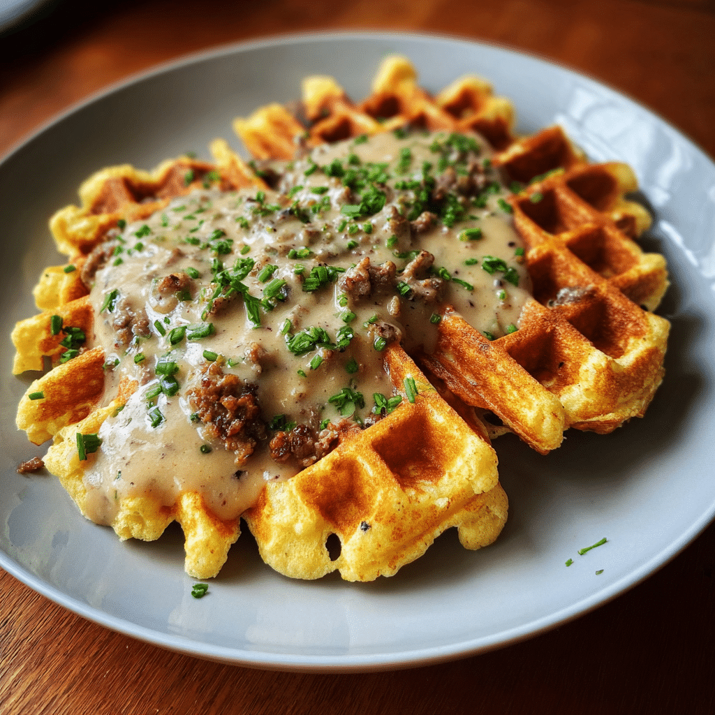 Cheddar Chive Waffles with Sausage Gravy elevate brunch through waffle iron genius crisp, cheesy, gravy-soaked perfection.