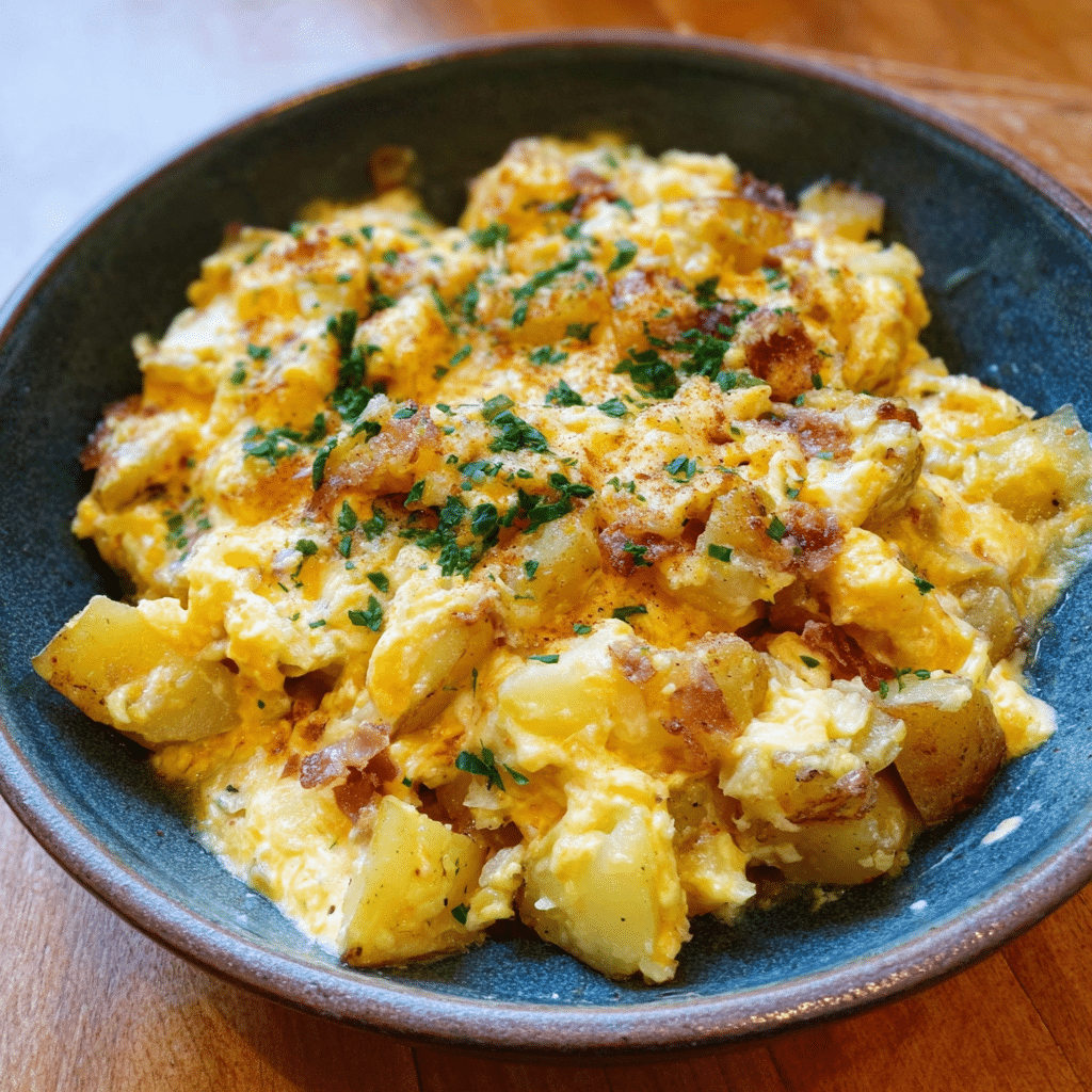 A warm and hearty breakfast made with golden potatoes, fluffy scrambled eggs, and gooey melted cheese quick to make and perfect for busy mornings.