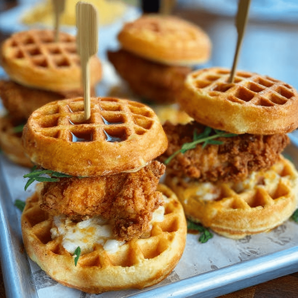 Savory-sweet chicken and waffle sliders featuring crispy chicken tucked between fluffy waffles and finished with buttery maple syrup a fun and irresistible handheld favorite.