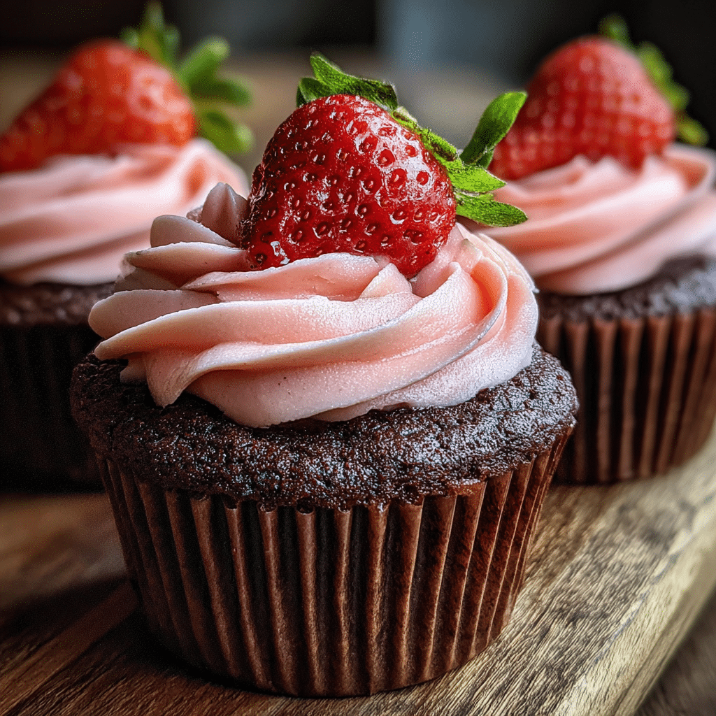 Moist, rich chocolate cupcakes topped with a fluffy strawberry buttercream made from real strawberries a classic, crowd-pleasing dessert with the perfect balance of chocolate and fruity sweetness.
