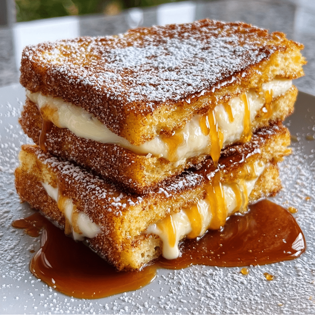 Decadent French toast stuffed with a sweet cream filling, coated in buttery cinnamon sugar for that perfect churro flavor.
