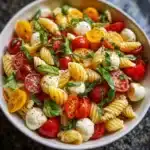 A vibrant and easy-to-make pasta salad combining rotini, cherry tomatoes, mozzarella, and basil, perfect for lunch or gatherings.