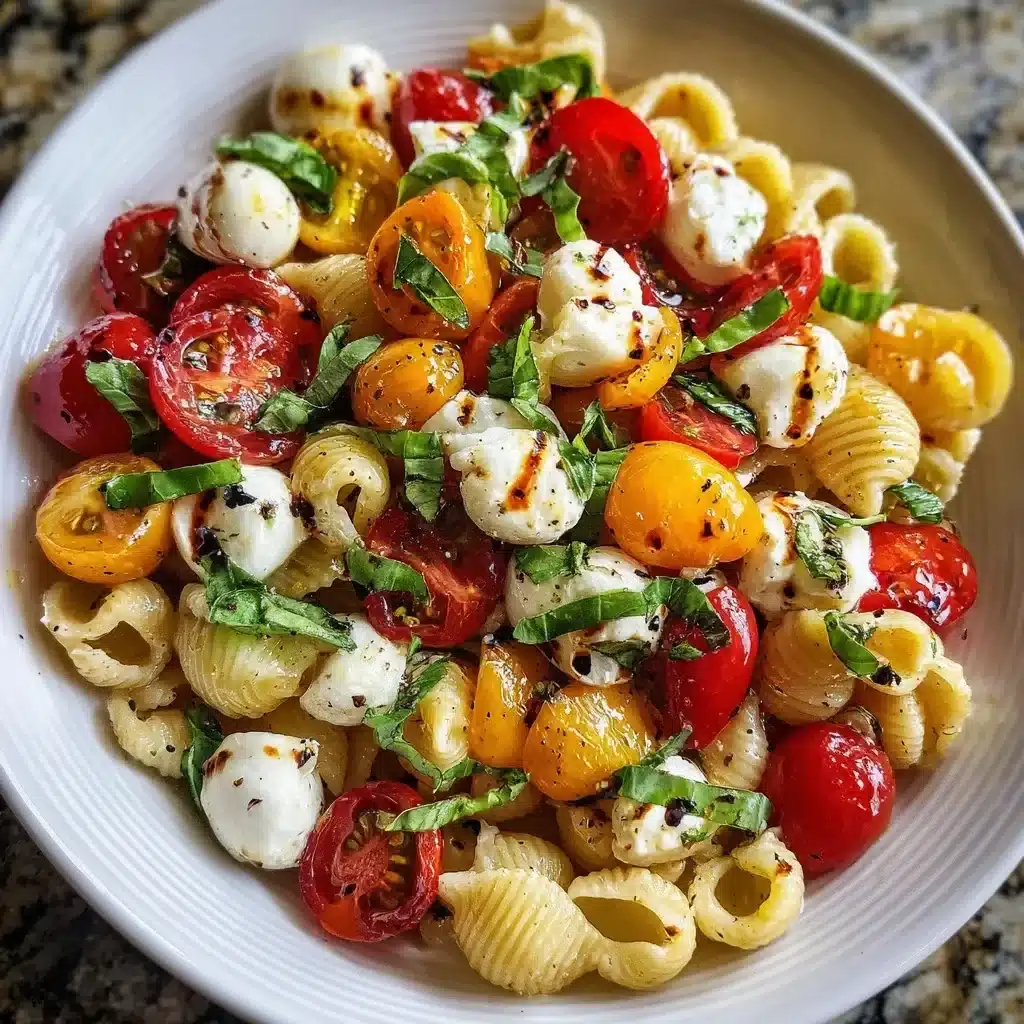 Keywords: Caprese pasta salad, summer salad, quick meal, vegetarian recipe