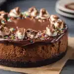 A decadent dessert that combines the rich texture of brownies with creamy cheesecake, topped with a luscious chocolate ganache and candy-coated chocolate pieces.