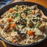 Creamy Chicken and Rice casserole is a comforting, all-in-one meal that blends tender chicken, cheesy rice, and aromatic herbs for easy family dinners. Delicious, cheesy, and hassle-free. Find more cozy recipes at dishfoody.com.