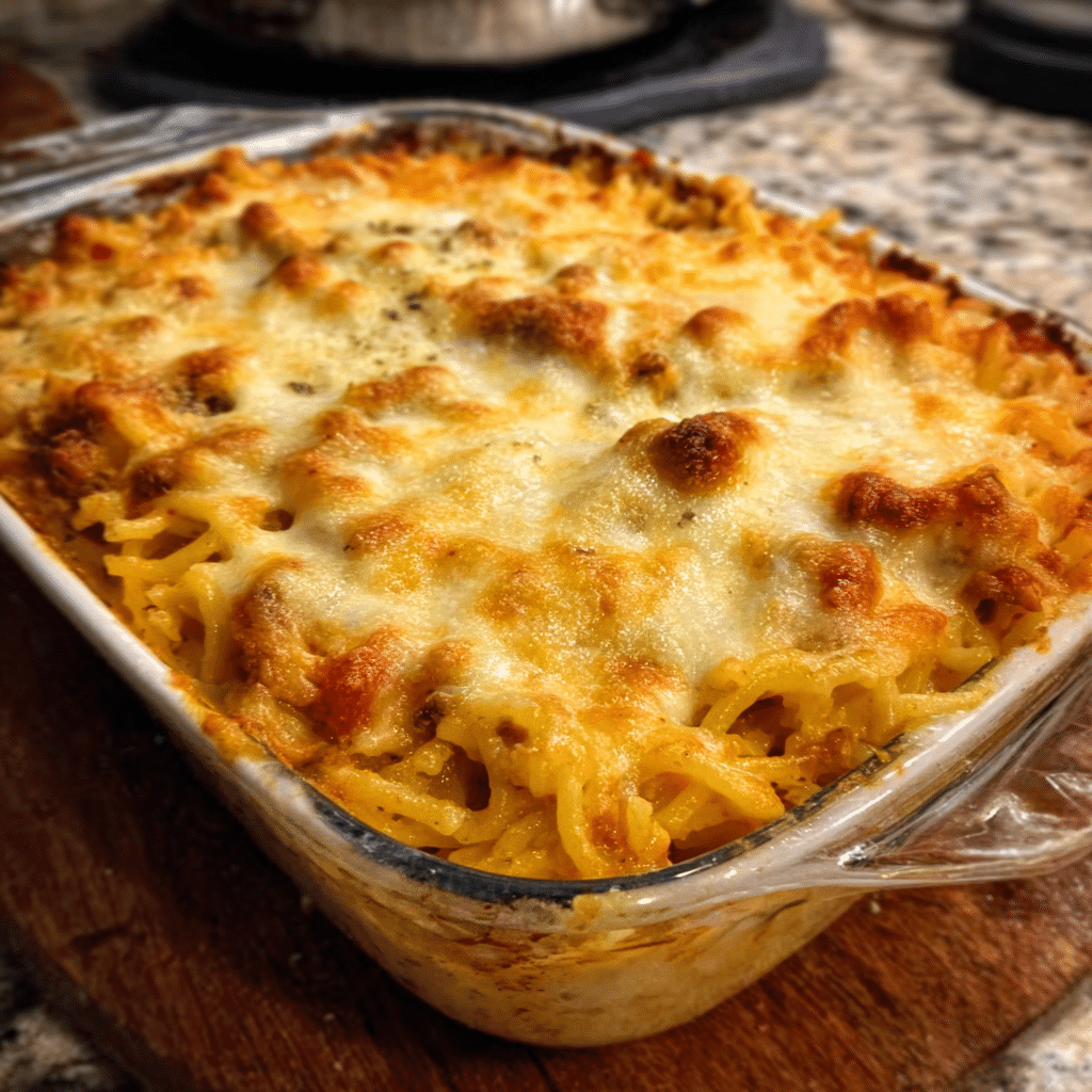A comforting Southern-style spaghetti casserole baked with rich meat sauce, cream cheese, and melted cheddar for the ultimate cozy dinner.
