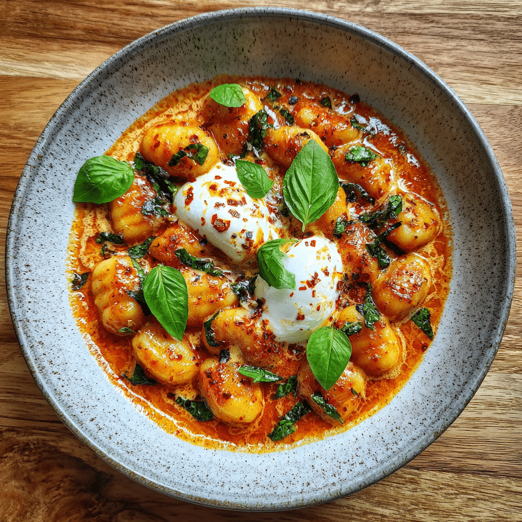 Soft pillowy gnocchi simmered in a rich and creamy tomato sauce, finished with fresh basil and topped with luxurious burrata for an indulgent yet simple Italian-inspired meal.