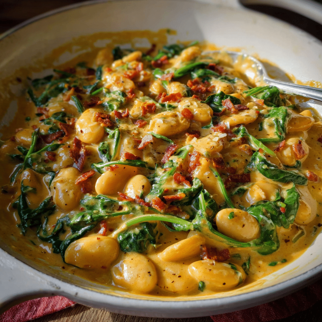 A rich, creamy Tuscan-inspired butter bean dish simmered in a velvety sun-dried tomato cream sauce with garlic, herbs, and parmesan. Comforting, cozy, and packed with flavor perfect with crusty bread or pasta.