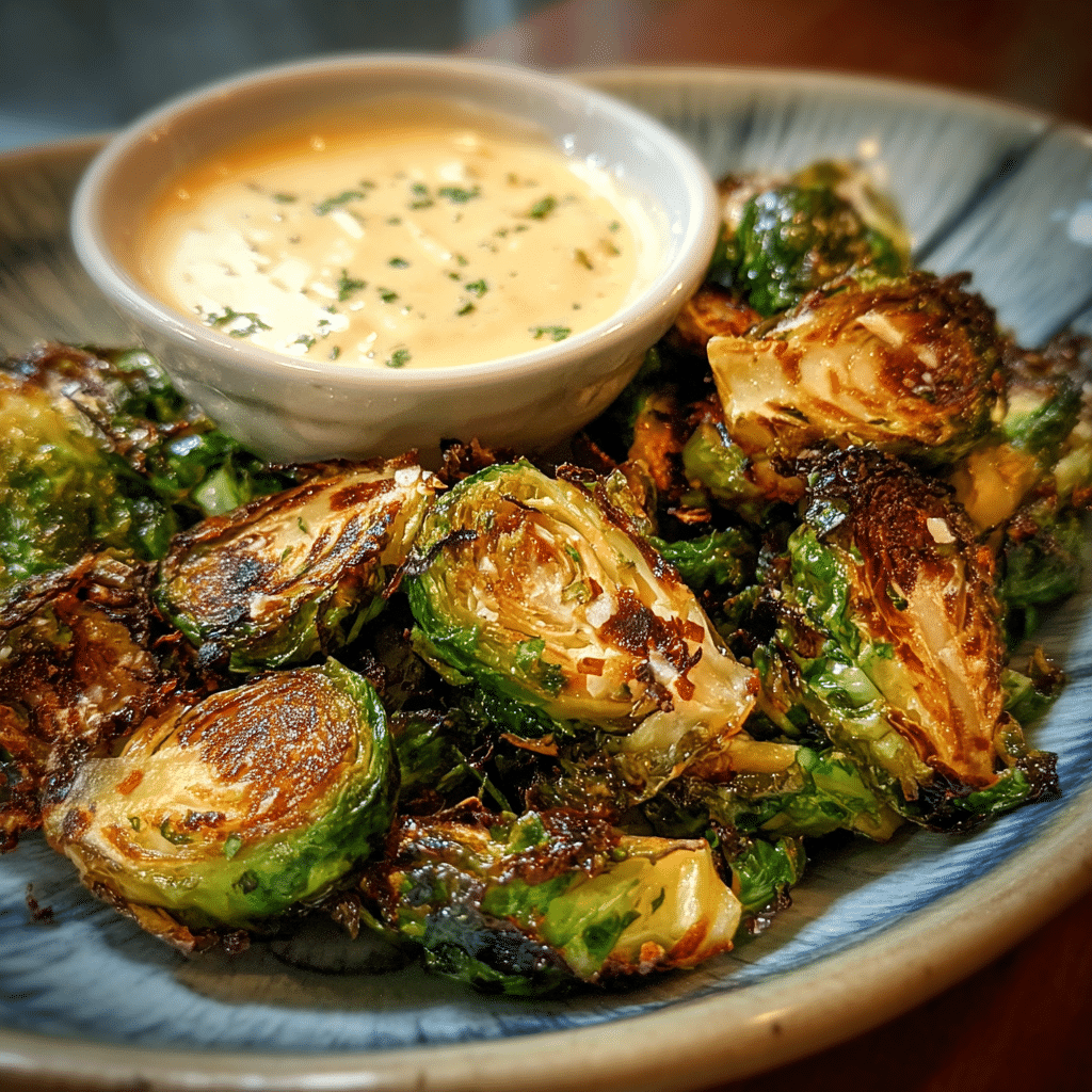 Irresistibly Crispy Brussels Sprouts roasted until golden and crunchy, served with creamy tangy Dijon aioli dipping sauce. Perfect game day snack, holiday side, or healthy appetizer everyone loves.