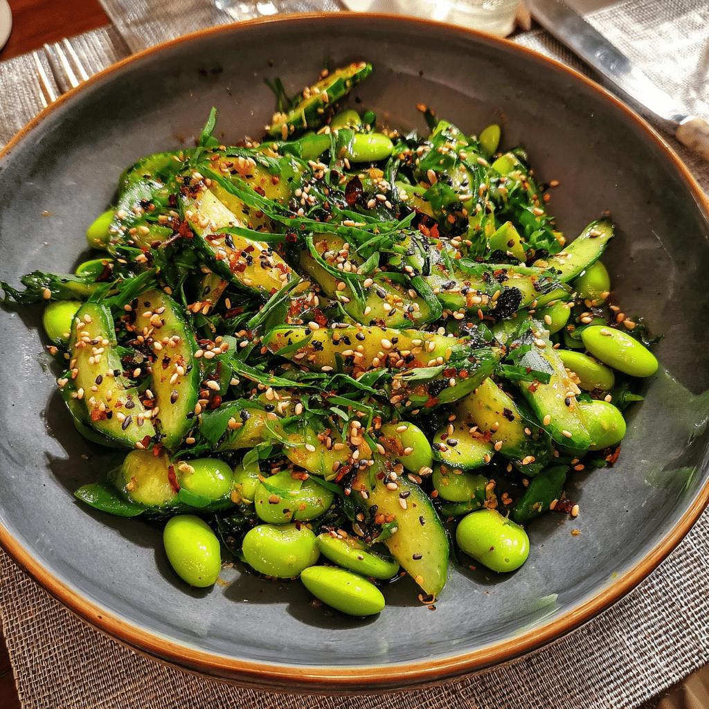Refreshing Cucumber Edamame Salad packed with protein-rich edamame, crisp cucumbers, fresh herbs, and a zesty sesame-ginger dressing. Perfect healthy side dish or light lunch.