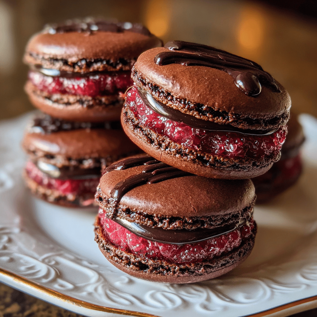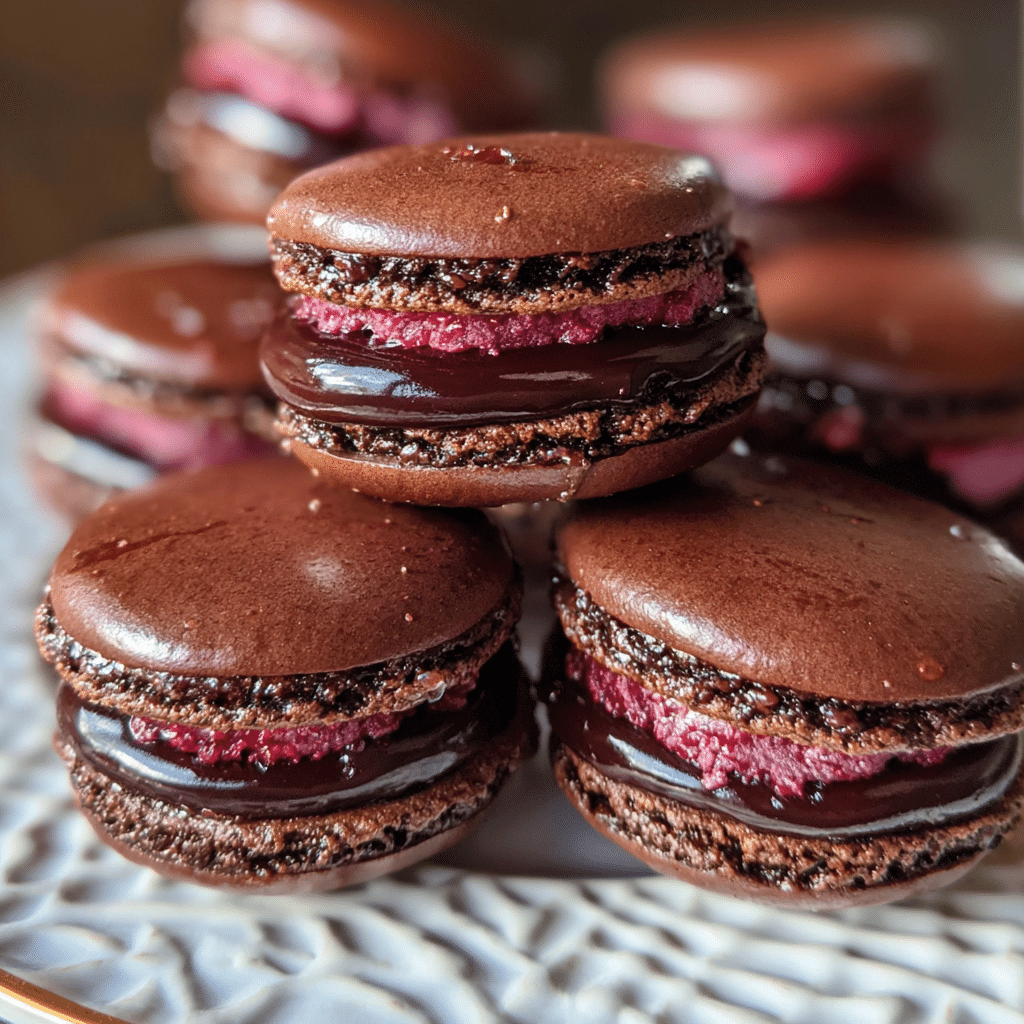 Delicate Dark Chocolate Raspberry Macarons filled with rich chocolate ganache and a hint of raspberry jam an elegant French treat with the perfect balance of sweet and tart.