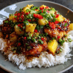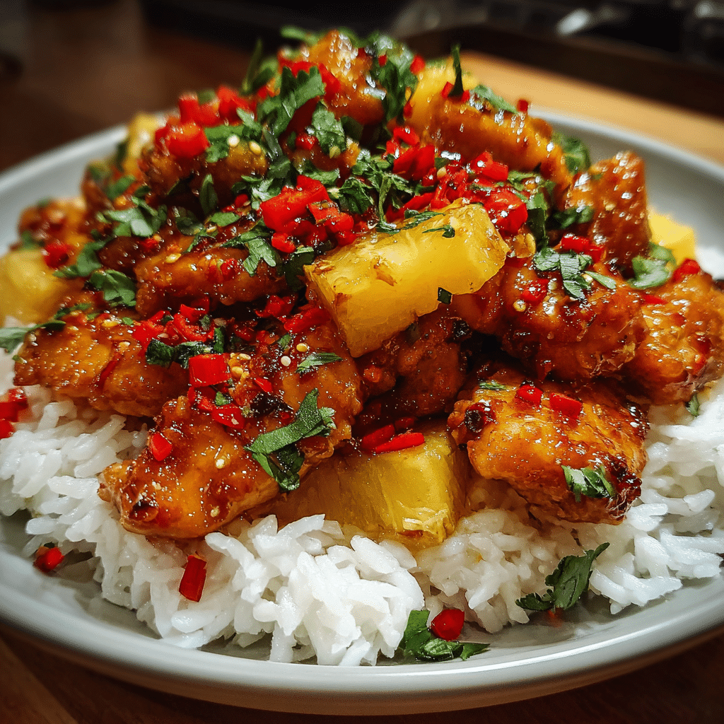 Easy Pineapple Chicken with Rice offers juicy chicken bites in a sweet-savory pineapple sauce, served over fluffy rice for tropical weeknight bliss. Bright pineapple chunks, colorful bell peppers, and sticky glaze create crave-worthy one-pan magic. Family favorite blending fruity tang with garlicky comfort.