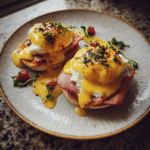 Eggs Benedict is a classic breakfast dish featuring perfectly poached eggs, Canadian bacon, and creamy hollandaise sauce atop toasted English muffins a true brunch favorite.