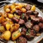 A warm and comforting dish combining tender beef with flavorful garlic butter and hearty baby potatoes, perfect for family dinners.