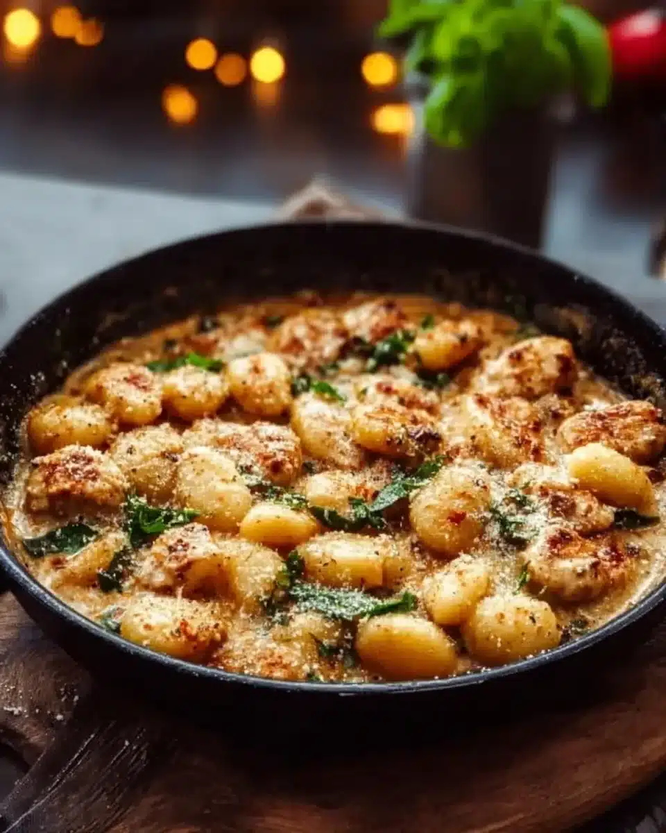 A comforting dish that combines tender chicken, fluffy gnocchi, and aromatic garlic in a creamy sauce, perfect for a weeknight dinner.