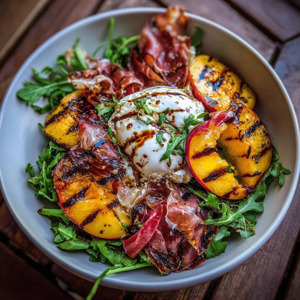 Grilling caramelizes nectarine sugars creating jammy texture. Burrata’s inner cream pools luxuriously over warm fruit. Prosciutto crisps add shattering crunch. Arugula’s bitterness cuts richness. Balsamic reduction provides sweet-tangy finish without overpowering.