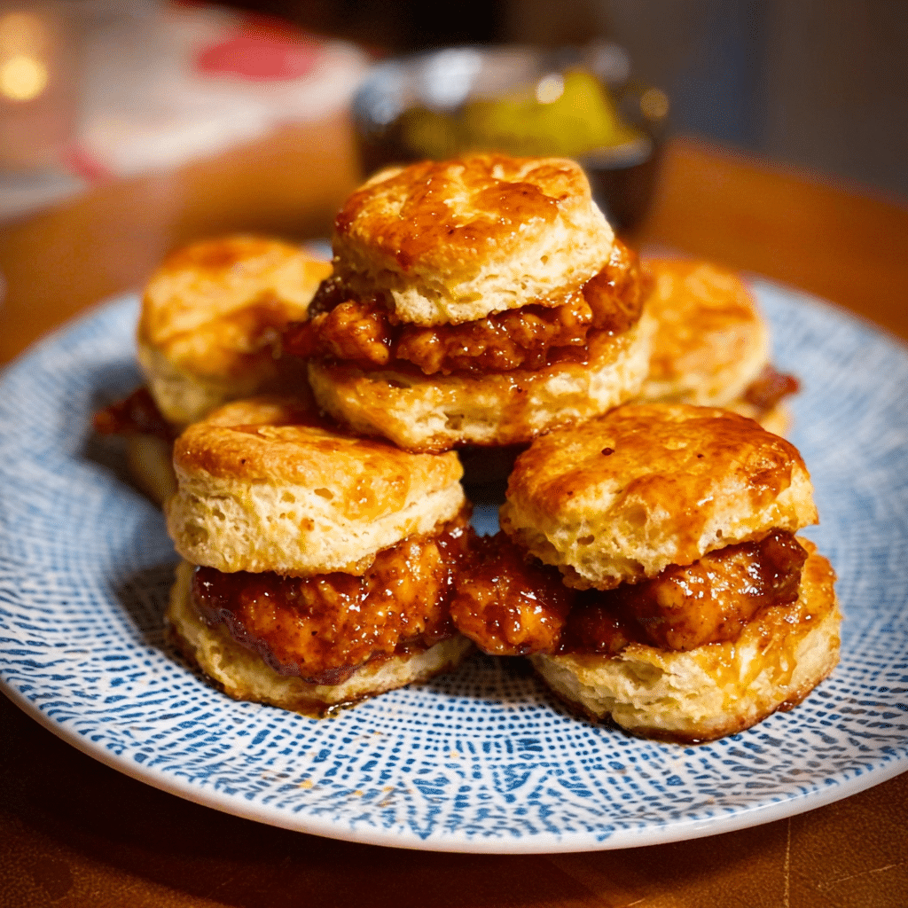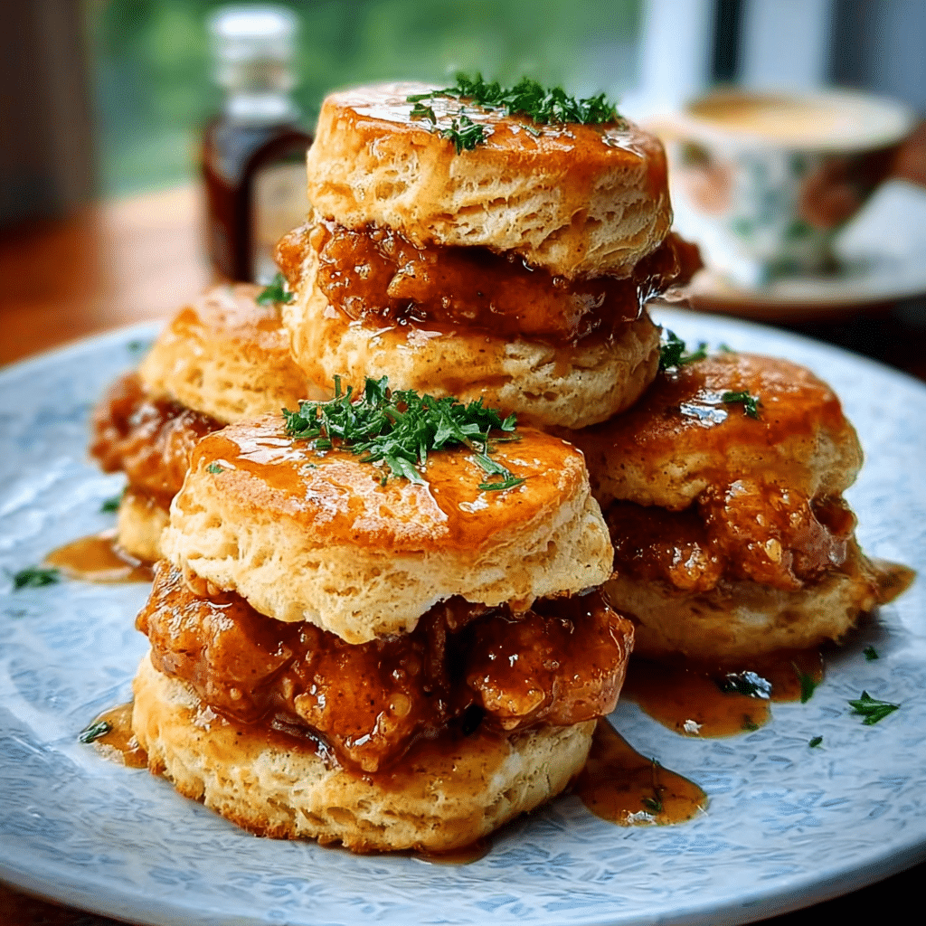 Crispy fried chicken sandwiched in buttery biscuits and drizzled with a sticky-sweet hot honey glaze the perfect balance of savory, spicy, and sweet for breakfast or brunch.
