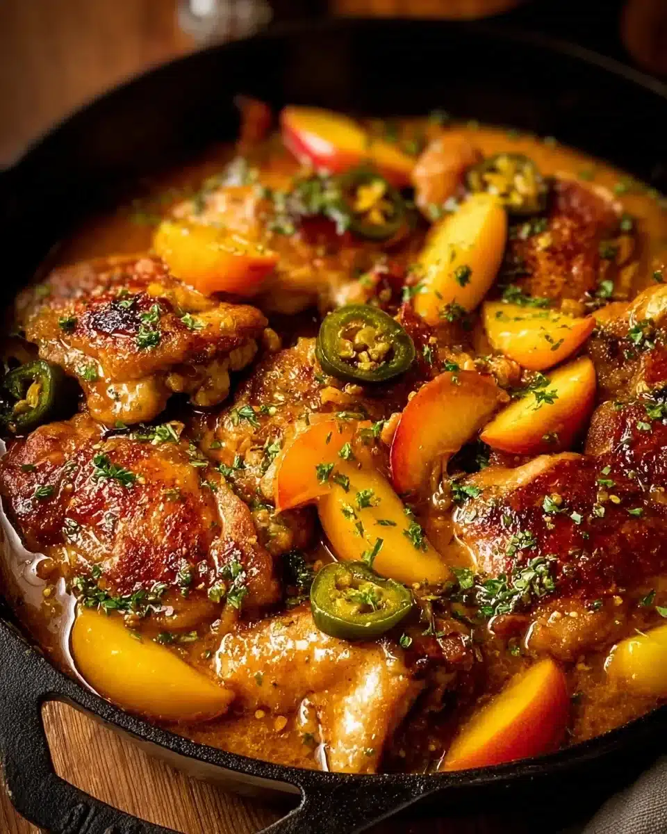 A delightful twist on a chicken dish that combines the sweetness of peaches with the heat of jalapenos, delivering a savory and sweet experience.
