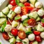 This Juicy Cucumber Caprese Salad is a refreshing twist on the traditional Caprese salad. With crisp cucumbers, sweet cherry tomatoes, creamy mozzarella, and fragrant basil, it’s perfect for summer picnics, barbecues, or just a light meal at home. The combination of flavors and textures makes it a delightful choice for any meal or occasion. Plus, it’s quick and easy to prepare, requiring minimal ingredients yet providing maximum taste.