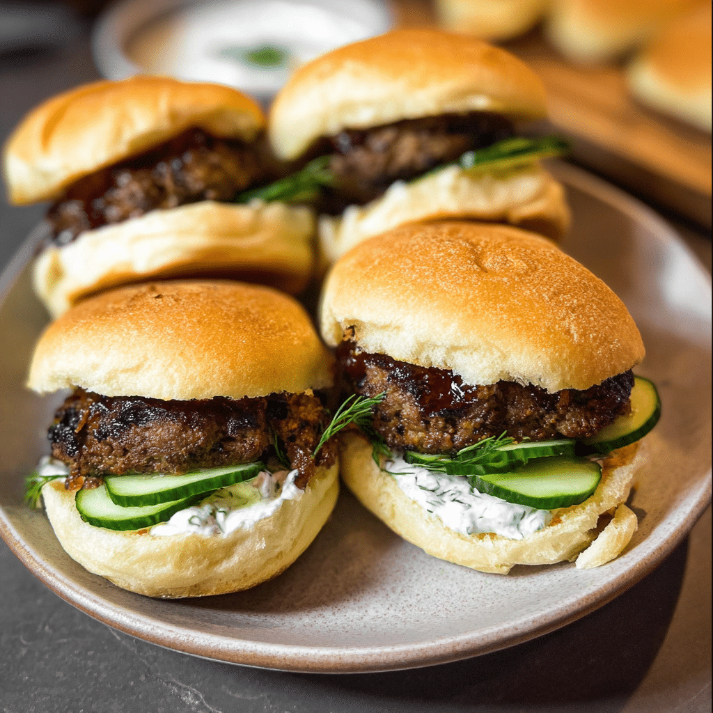 Juicy and flavorful lamb sliders served on soft buns with optional toppings like feta, cucumber, arugula, and a creamy tzatziki sauce. Perfect for game day or a casual dinner.