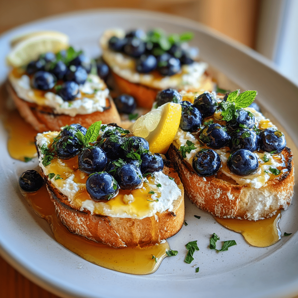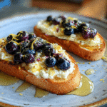 Lemon Blueberry Ricotta Toast with Honey layers creamy ricotta whipped with lemon zest over toasted sourdough, topped with juicy fresh blueberries and golden honey drizzle. Elegant 5-minute breakfast transforms simple toast into brunch-worthy treat.