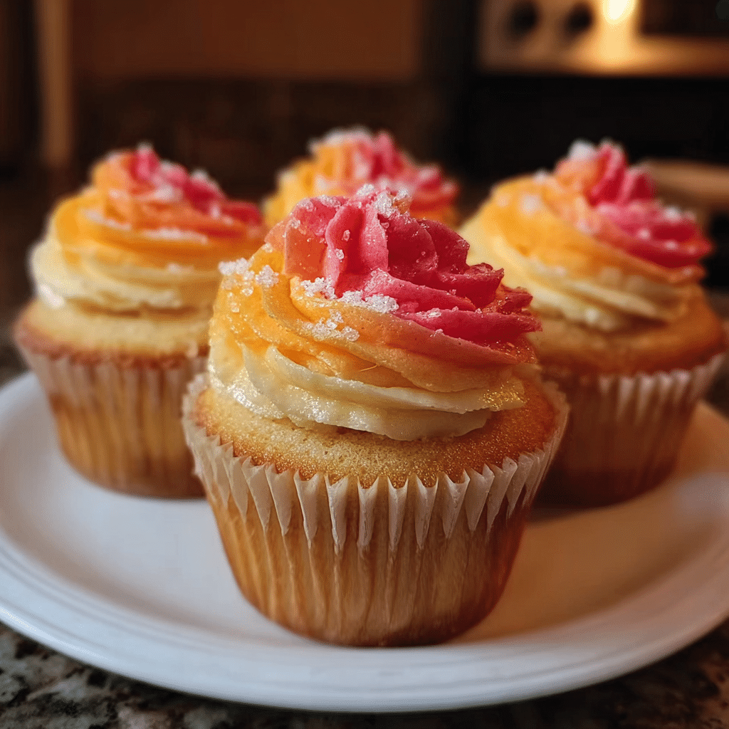 Mango Strawberry Sunset Cupcakes feature tender vanilla cupcakes infused with fresh mango puree, filled with strawberry jam, and crowned with stunning sunset-swirl buttercream blending mango yellow and strawberry pink. Perfect tropical celebration dessert with vibrant colors and flavors.