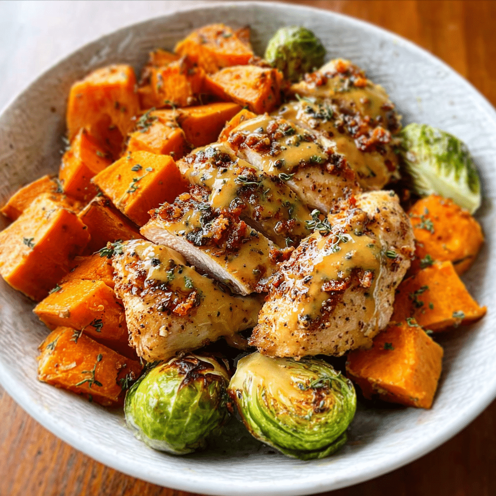 Before starting your Maple Dijon Chicken & Sweet Potato Bowls, preheat your oven to 425°F. Line two large baking sheets with parchment paper or aluminum foil for easy cleanup. Pat chicken dry and cut into uniform pieces. Peel and cube sweet potatoes into 1-inch pieces. Halve Brussels sprouts and cut onion into wedges.