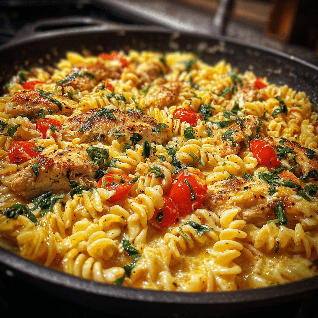 One-pan method builds layered flavor from chicken sear. Sun-dried tomatoes concentrate sweetness without cooking. Cream finishes silky without separation. Pasta absorbs sauce completely. Parmesan melts into glossy emulsion.