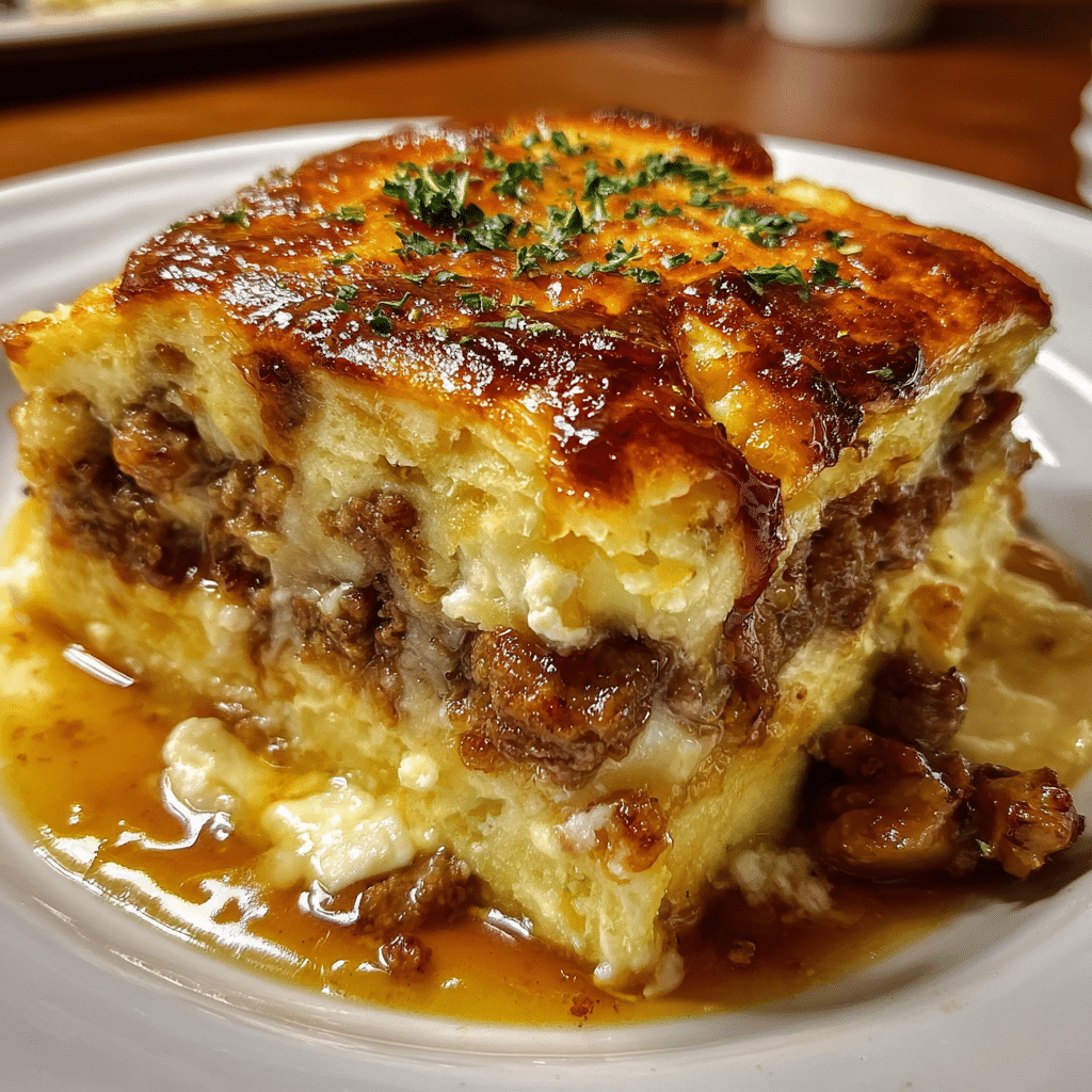 A hearty and comforting pancake sausage casserole layered with fluffy pancakes, savory sausage, and a rich custard base perfect for breakfast or brunch.