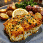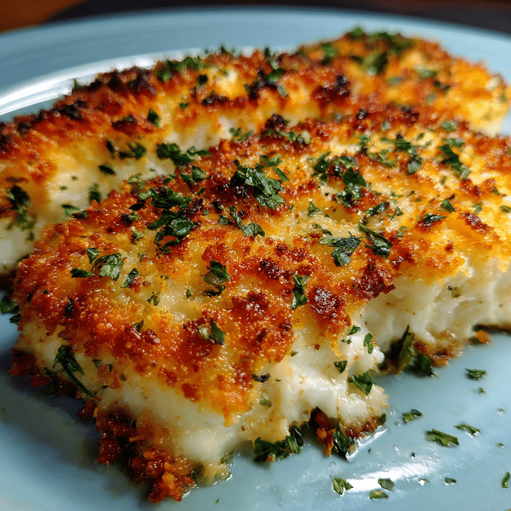 Parmesan Crusted Baked Halibut delivers crispy golden panko-Parmesan topping over flaky tender halibut fillets. Lemon-garlic-herb crust bakes in 15 minutes creating elegant weeknight dinner with restaurant-quality presentation.