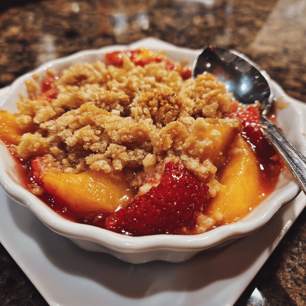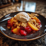 Peach & Strawberry Crisp layers ripe summer peaches and strawberries beneath buttery oatmeal crumble for juicy bubbling fruit and crunchy cinnamon topping. Ready in 50 minutes, it serves 8 with perfect fruit-to-crisp ratio and optional vanilla ice cream.