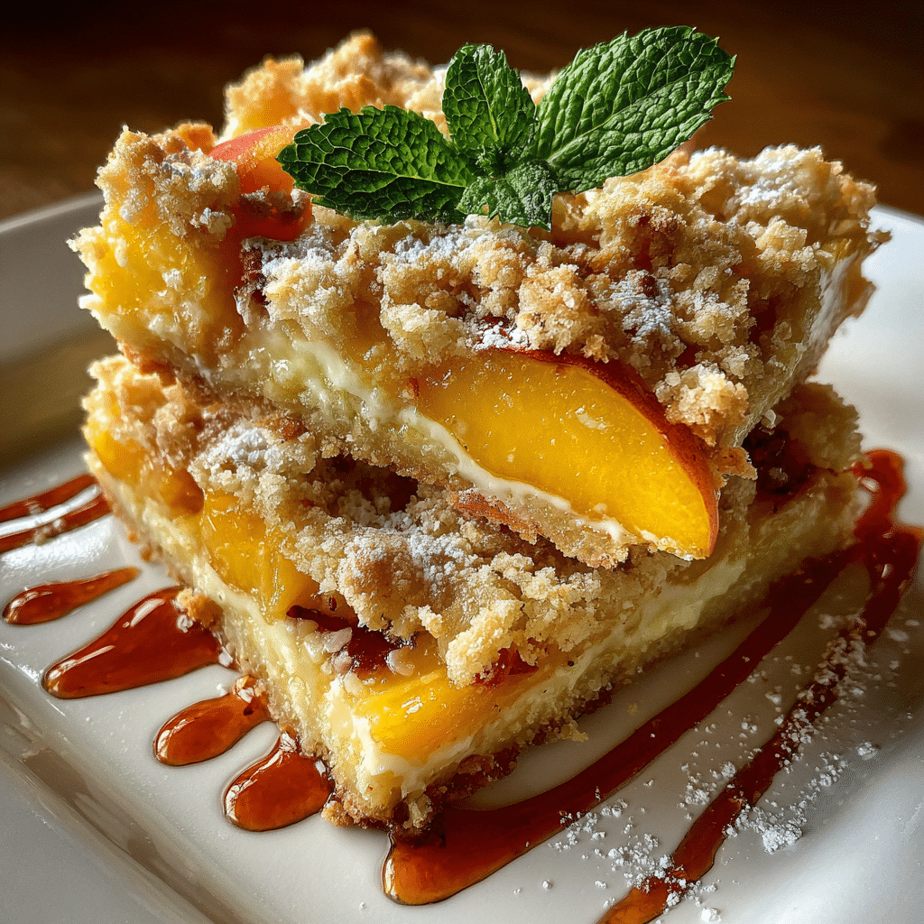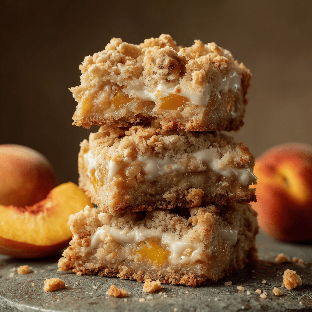 Peaches and Cream Crumble Bars feature buttery shortbread crust, creamy cheesecake layer, juicy ripe peaches, and crunchy cinnamon oat crumble topping. Perfect portable summer dessert combining peaches-and-cream classic with irresistible crumble texture.