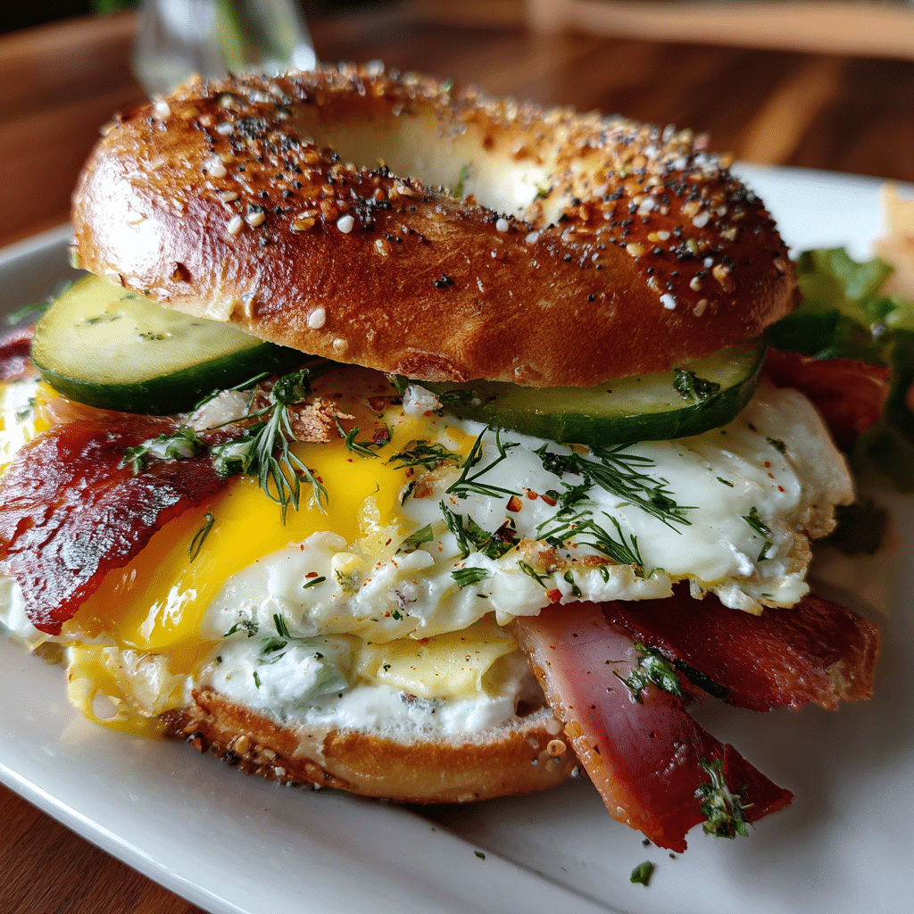 Pickle & Dill Cream Cheese Bagel Breakfast Sandwich tangy-hugs mornings briny perfection.
