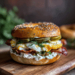 Hi, I’m Sam from dishfoody.com, where comforting classics get a fresh twist. Pickle & Dill Cream Cheese Bagel Breakfast Sandwich spreads tangy chopped pickle cream cheese over toasted everything bagel with fried egg, crispy bacon, and everything seasoning for briny breakfast perfection. Ready in 8 minutes, it serves 2 with pickle crunch cutting creamy richness beautifully.
