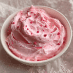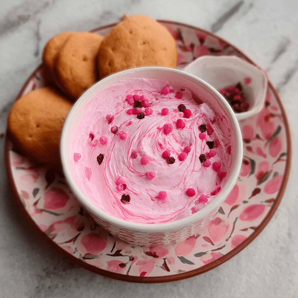 A fun, sweet pink party dip made with cream cheese, whipped topping, and strawberry flavor fluffy, creamy, and perfect for dipping cookies, fruit, or graham crackers at Valentine’s Day parties.