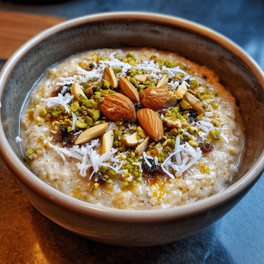 5. Divide into bowls, top with toasted coconut, extra pistachios, and optional toppings. Serve warm.
