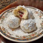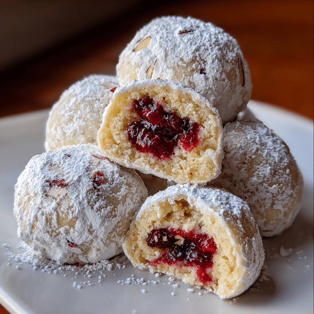 Raspberry Filled Almond Snowball Cookies blend rich almond flavor with sweet, tangy raspberry filling and a snowy sugar coating for a truly irresistible treat. Easy to make and beautiful to serve, these cookies are sure to be a crowd-pleaser. For more delightful desserts, visit dishfoody.com and try our Tiramisu Cookies next!