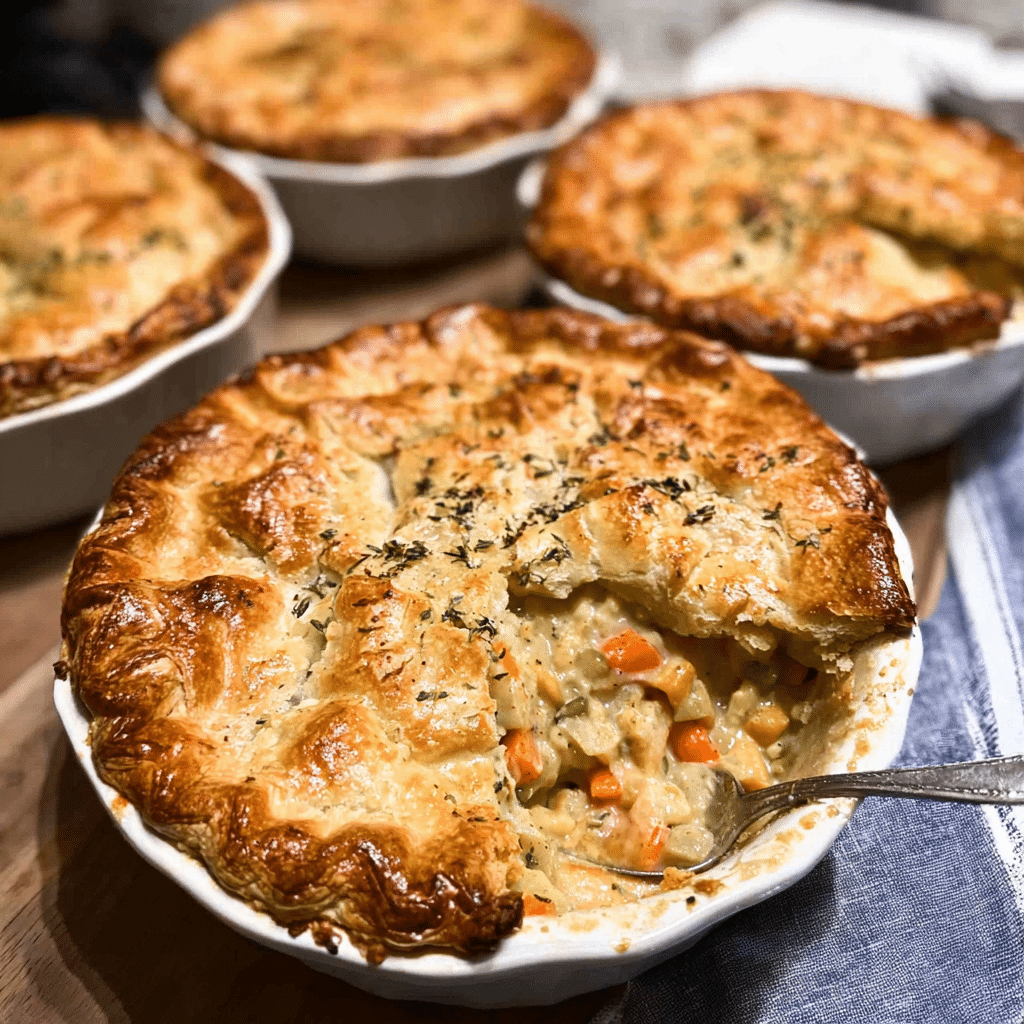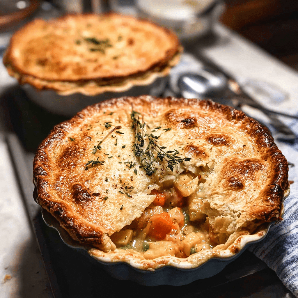Serve pot pies directly in ramekins on charger plates for rustic elegance. Garnish with fresh thyme sprigs or microgreens. Add a small side salad on the same plate for color contrast. Serve with cloth napkins since breaking into the flaky crust can be delightfully messy.