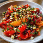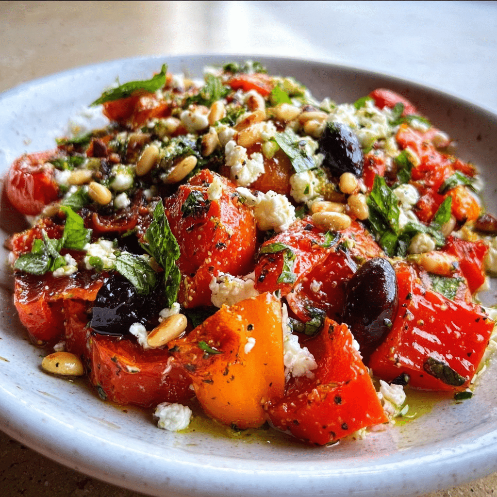 Roasted red pepper salad features charred sweet peppers with tangy vinaigrette, fresh herbs, and briny olives. Smoky peppers contrast creamy feta and crisp greens in this vibrant Mediterranean side perfect for grilled meats or as a mezze platter star.