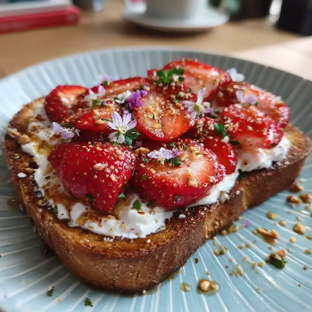 - Spread the whipped ricotta over the toasted bread, top with the roasted strawberries, and garnish with fresh mint if desired. Serve immediately.