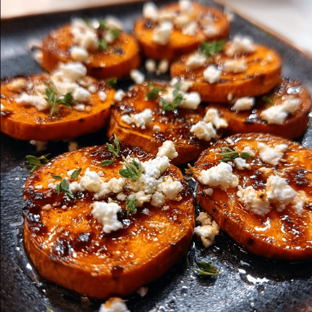 Caramelized roasted sweet potato rounds topped with creamy feta, a drizzle of honey, and a sprinkle of herbs for a simple yet elegant appetizer or side dish.