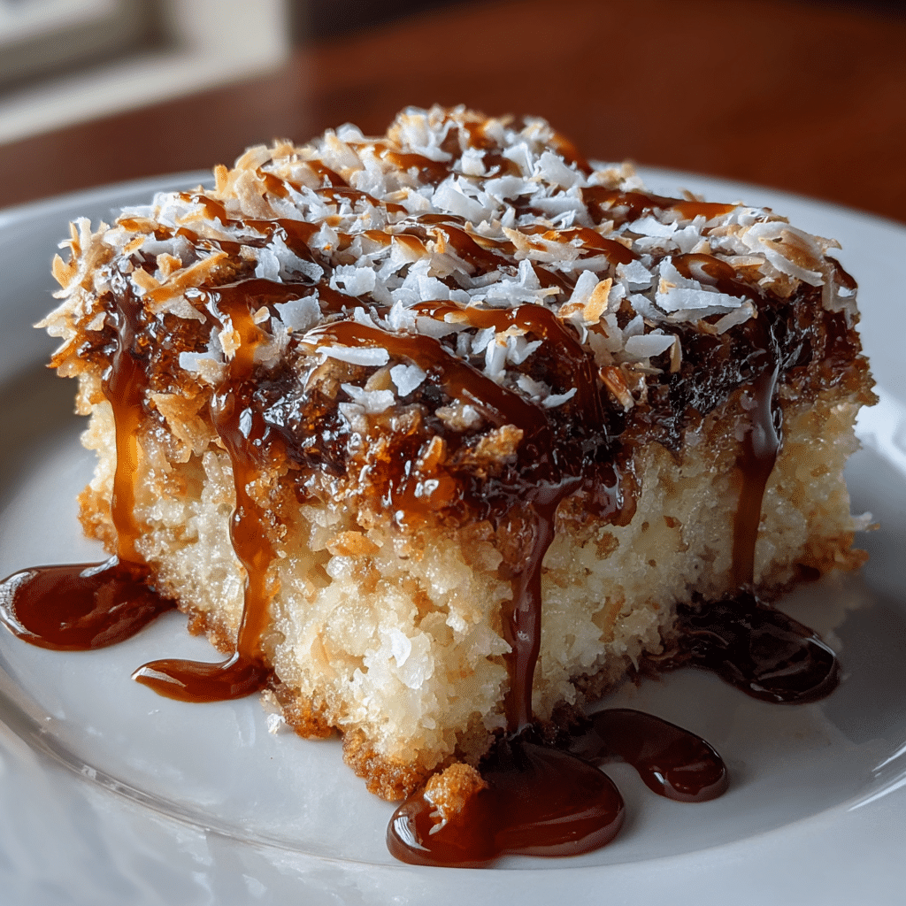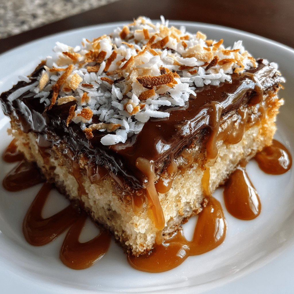 Texas sheet cake base stays moist from boiling water method. Toasted coconut adds caramelized crunch. Quick caramel sauce soaks in without sogginess. Chocolate ganache sets firm yet sliceable. Crowd-sized pan feeds dozens easily.