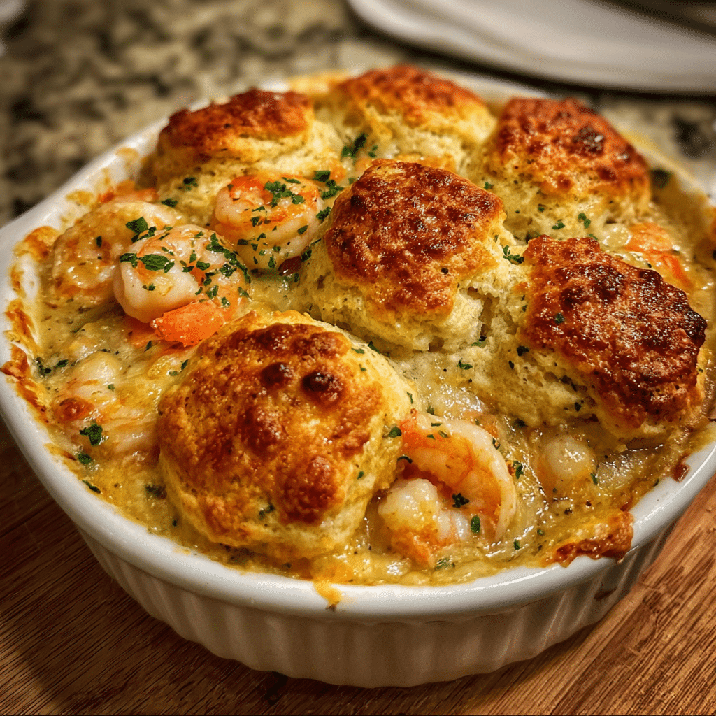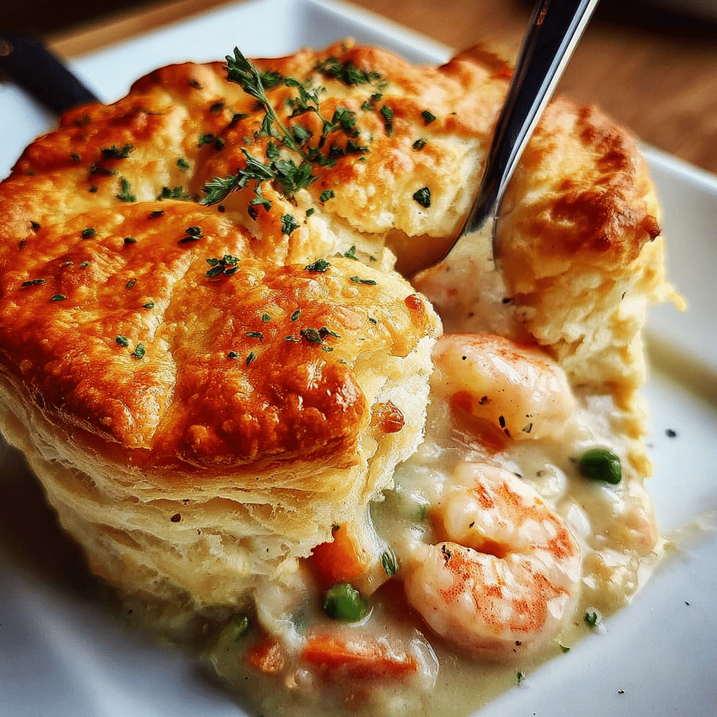 Shrimp & Lobster Biscuit Pot Pie is a luxurious, comforting blend of tender seafood nestled in a creamy sauce, topped with golden, flaky biscuits that make every bite irresistible.