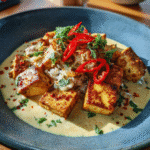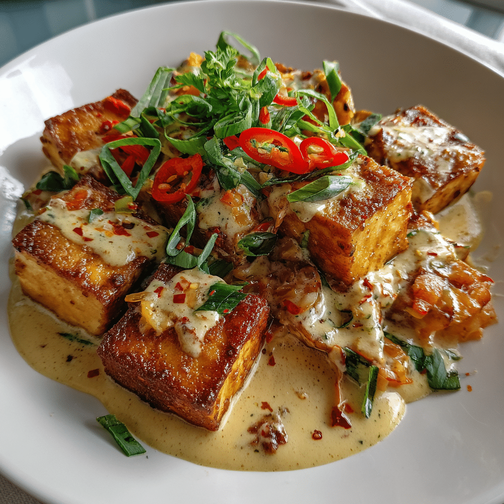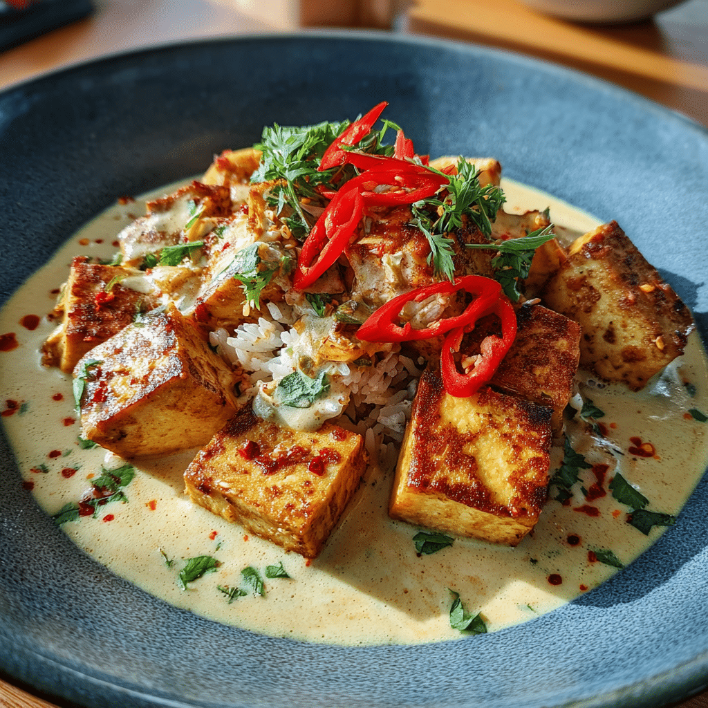 This dish is hearty, gluten-free adaptable, and perfect for spice lovers. Crispy tofu contrasts creamy heat beautifully.