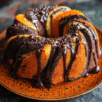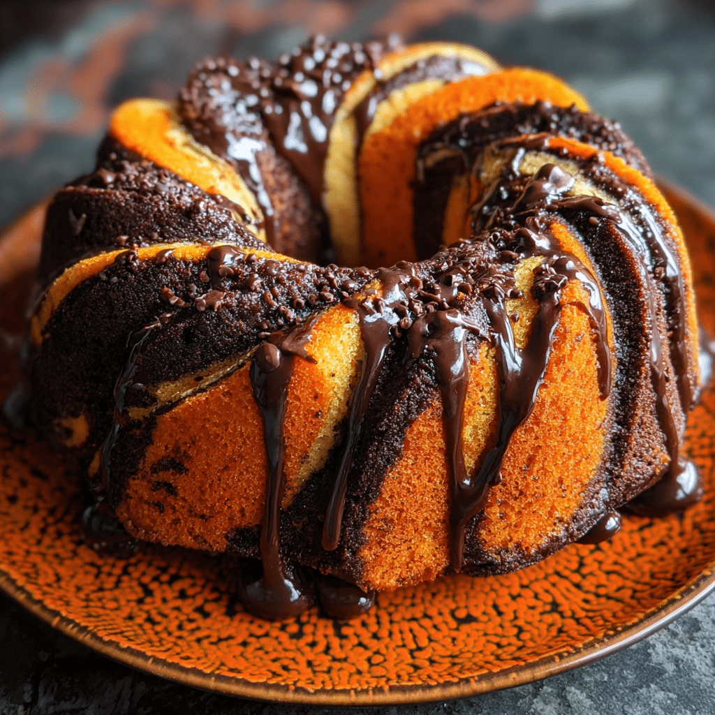 A spooky, swirled Halloween Bundt cake with chocolate and orange layers, topped with a festive glaze perfect for parties and fall celebrations.