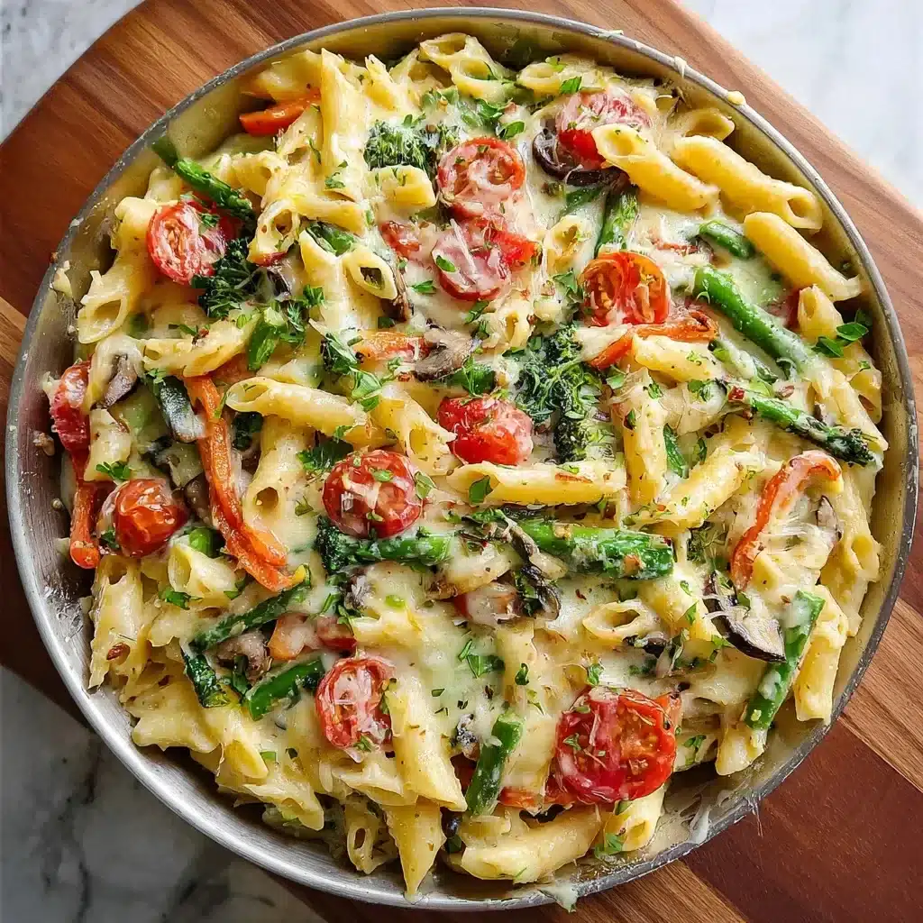 Keywords: pasta, spring, vegetarian, creamy, vegetables